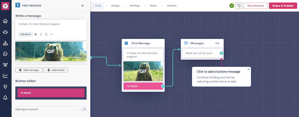 Success! My first message was generated with no surprises. Depending on the purpose of your chatbot, you can direct the conversation: