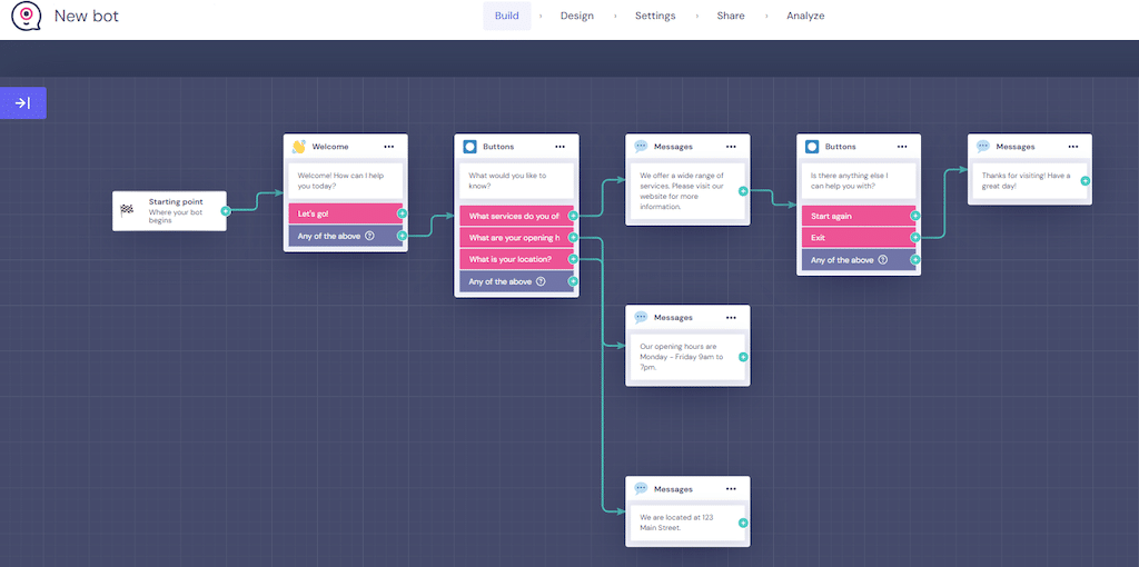Unlike most chatbots, Landbot offers a free canned-response chatbot option. It has limited capabilities but would satisfy simple needs or serve as a way to experiment with bot building.